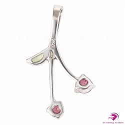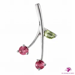 Craquant et plein de fraîcheur, ce pendentif en Argent 925 évoque une branche de cerises : deux tourmalines rubellites rose, facettées et serties de griffes, rappellent de jolies petites cerises brillantes, tandis que la tourmaline verdélite verte vient compléter l’ensemble comme une feuille lumineuse. Son design fin et moderne apporte une touche fruitée, élégante et originale, idéale pour illuminer une tenue au quotidien comme pour une occasion spéciale.
